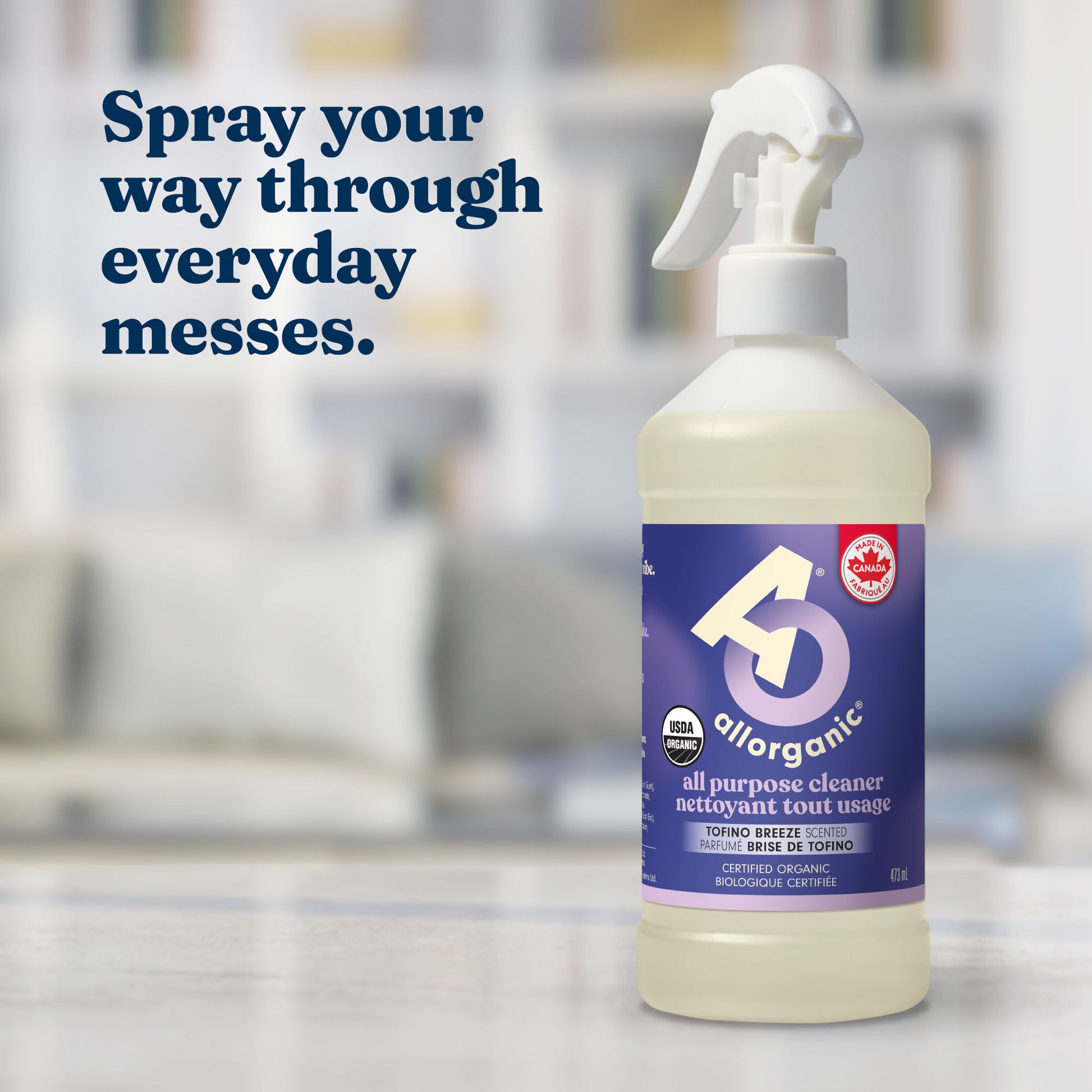 allorganic® Tofino Breeze all purpose cleaner keeps every surface in your home clean. Lightly scented with essential oils of citrus, balsam fir, lavender, and cedar to leave every space naturally fresh.