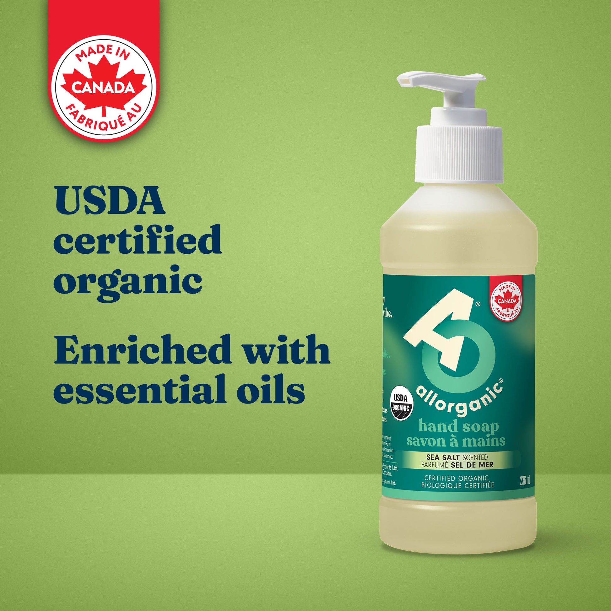 allorganic® Sea Salt liquid hand soap moisturizes and nourishes hands. Naturally scented with essential oils of tea tree, bergamot, geranium and vetiver to leave hands clean and lightly fragranced.